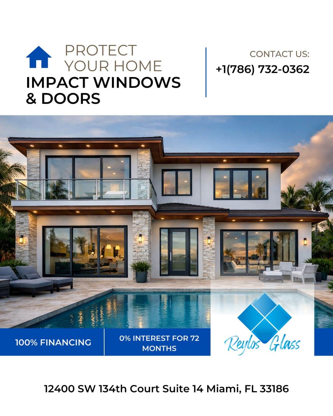 Modern home with impact windows and doors from Reylos Glass. If you’re looking for a solution that offers both style and security, professional impact windows and doors are an excellent choice. 100% financing with 0% interest for 72 months. Protect your home in style!